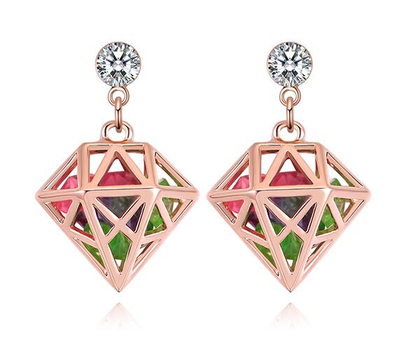 Aretes en baño de oro rosa de 18 quilates, original diseño de pentágono con incrustaciones de cristales en colores. Fabricado en una estructura de aleación de platino con rodio sin níquel.
