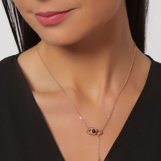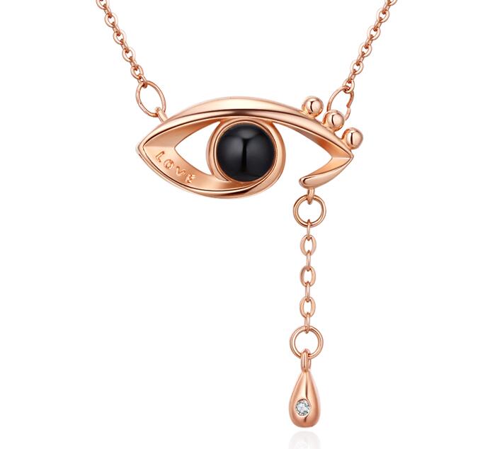 Collar en baño de oro rosa de 18 quilates, original diseño de ojo, coloca luz flash y te reflejara la palabra "Te Amo" en varios idiomas, con incrustraciones de cristal en color blanco.