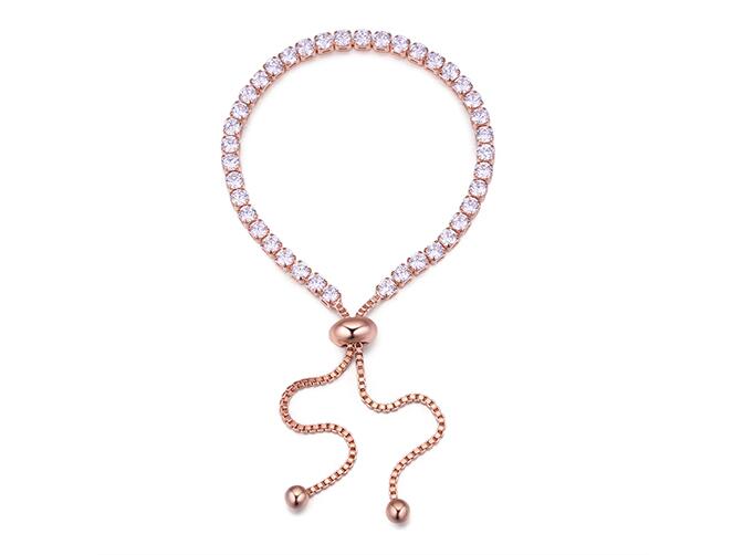 Hermosa pulsera en baño de oro rosa de 18 quilates, diseño con incrustraciones de cristales en color blanco. Fabricado en una estructura de aleación de platino con rodio sin níquel.
