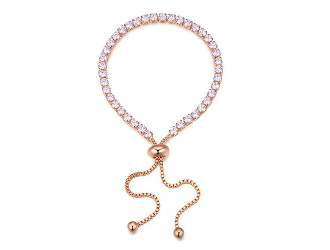 Hermosa pulsera en baño de oro amarillo de 18 quilates, diseño con incrustraciones de cristales en color blanco. Fabricado en una estructura de aleación de platino con rodio sin níquel.