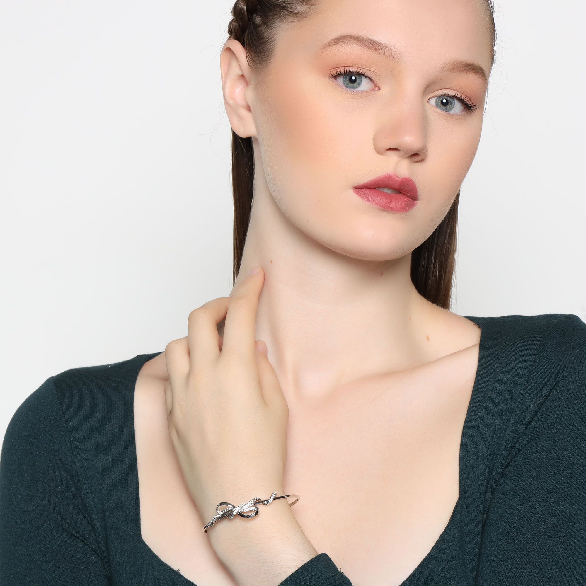 Hermoso brazalete en baño de oro blanco de 18 quilates, lindo diseño de moño con incrustración de cristales en color blanco. Fabricado en una estructura de aleación de platino con rodio sin níquel.