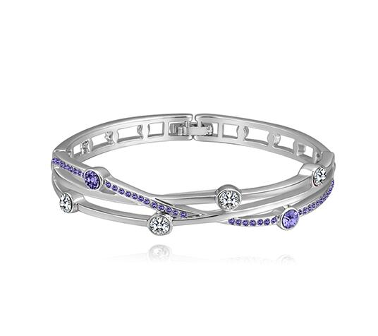 Lindo brazalete en baño de oro blanco de 18 quilates, lindo diseño entrelazado con incrustración de cristales en color blanco y morado. Fabricado en una estructura de aleación de platino con rodio sin níquel.