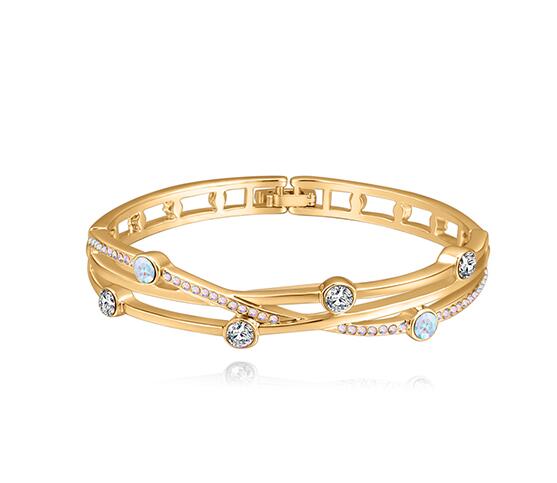 Lindo brazalete en baño de oro amarillo de 18 quilates, lindo diseño entrelazado con incrustración de cristales en color tornasol. Fabricado en una estructura de aleación de platino con rodio sin níquel.