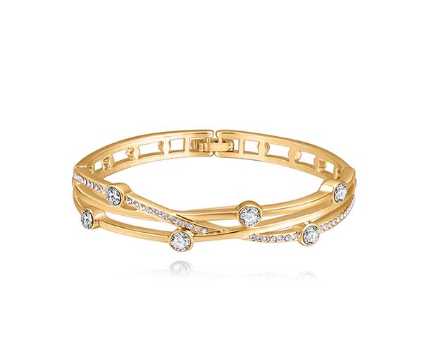 Lindo brazalete en baño de oro amarillo de 18 quilates, lindo diseño entrelazado con incrustración de cristales en color blanco. Fabricado en una estructura de aleación de platino con rodio sin níquel.