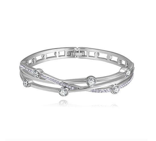 Lindo brazalete en baño de oro blanco de 18 quilates, lindo diseño entrelazado con incrustración de cristales en color blanco. Fabricado en una estructura de aleación de platino con rodio sin níquel.