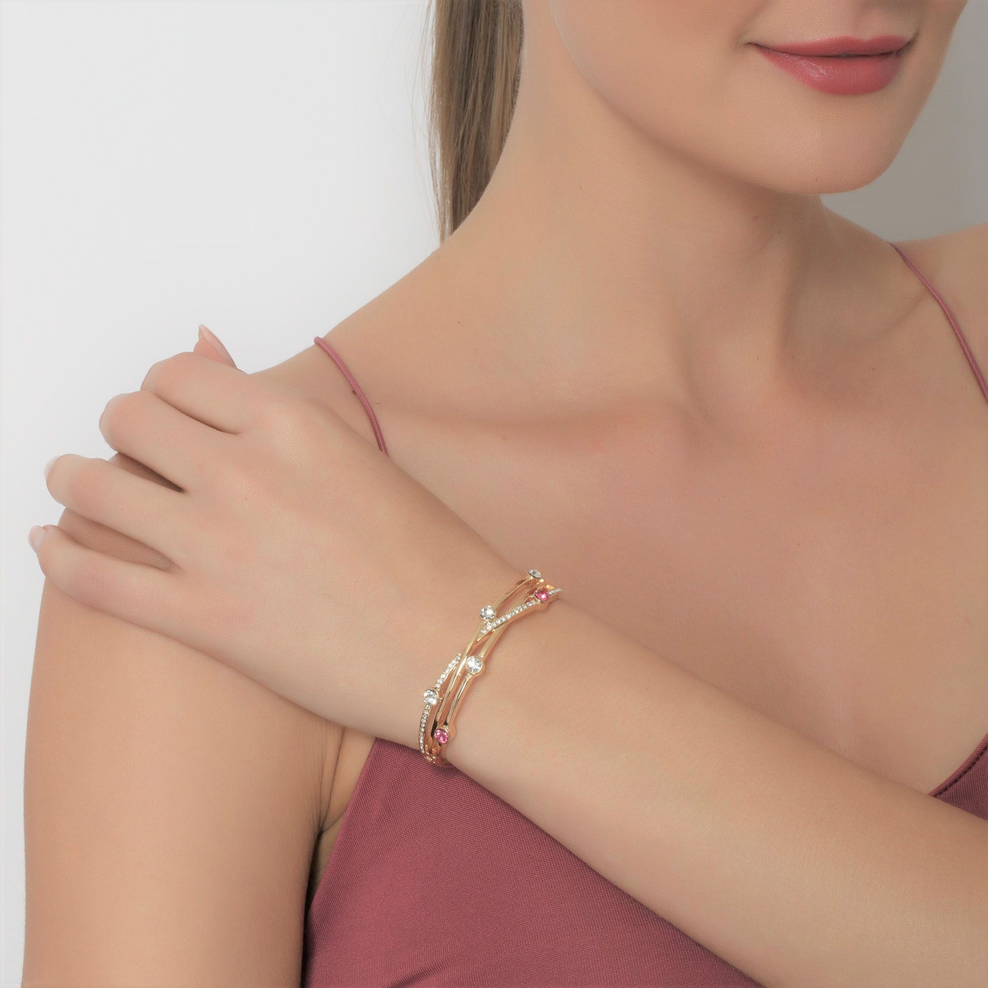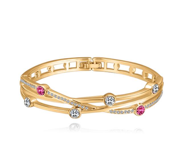 Lindo brazalete en baño de oro amarillo de 18 quilates, lindo diseño entrelazado con incrustración de cristales en color blanco y rosa. Fabricado en una estructura de aleación de platino con rodio sin níquel.