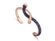 Elegante brazalete en baño de oro amarillo de 18 quilates, original diseño entrelazado, con incrustracion de cristales en color azul marino y blancos en el extremo. Fabricado en una estructura de aleación de platino con rodio sin níquel.