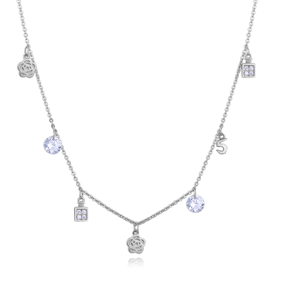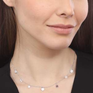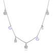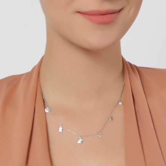 Collar en baño de oro blanco de 18 quilates, diseño con charms y cristales que cuelgan de la cadena e incrutraciones de cristales en color blanco. Fabricado en una estructura de aleación de platino con rodio sin níquel.