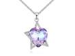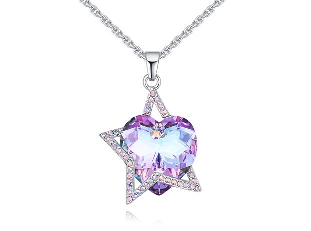 Lindo dije con cadena en baño de oro blanco de 18 quilates, diseño de corazón con media estrella e incrustraciones de cristales en color morado y tornasol. Fabricado en una estructura de aleación de platino con rodio sin níquel.