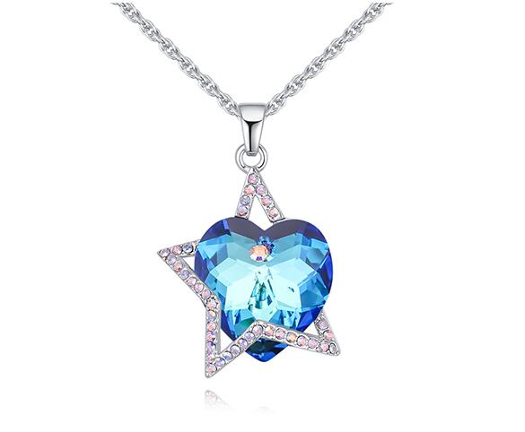 Lindo dije con cadena en baño de oro blanco de 18 quilates, diseño de corazón con media estrella e incrustraciones de cristales en color azul y tornasol. Fabricado en una estructura de aleación de platino con rodio sin níquel.