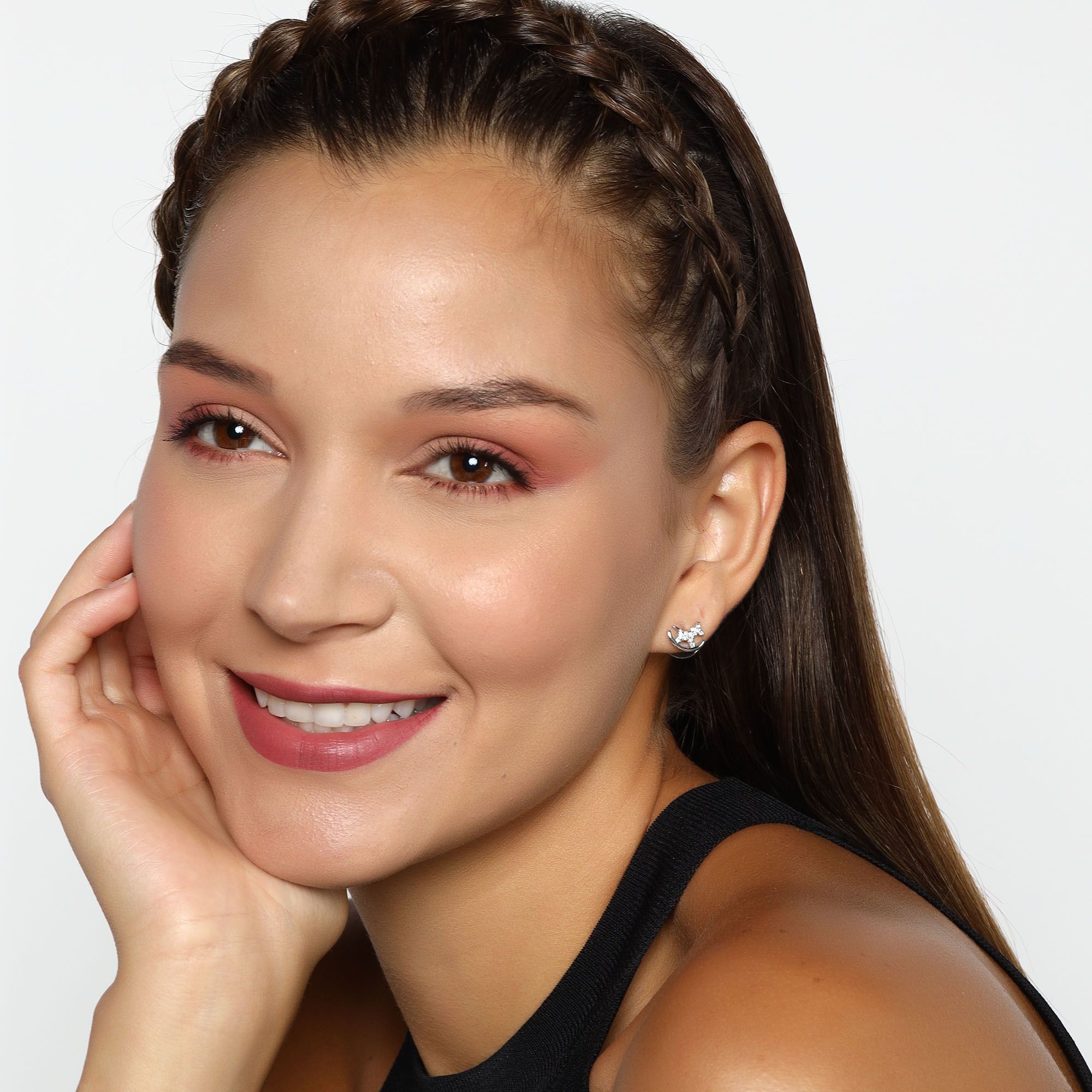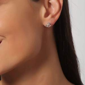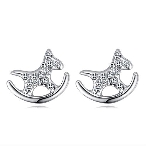 Originales aretes en baño de oro blanco de 18 quilates, tierno diseño de caballito balancin con detalles en cristales color blanco. Fabricado en una estructura de aleación de platino con rodio sin níquel.