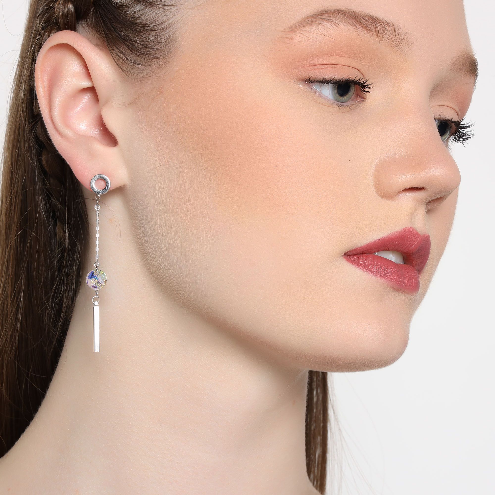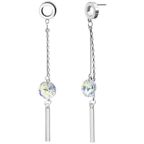 Originales aretes en baño de oro blanco de 18 quilates, diseño con cristales color tornasol. Fabricado en una estructura de aleación de platino con rodio sin níquel.