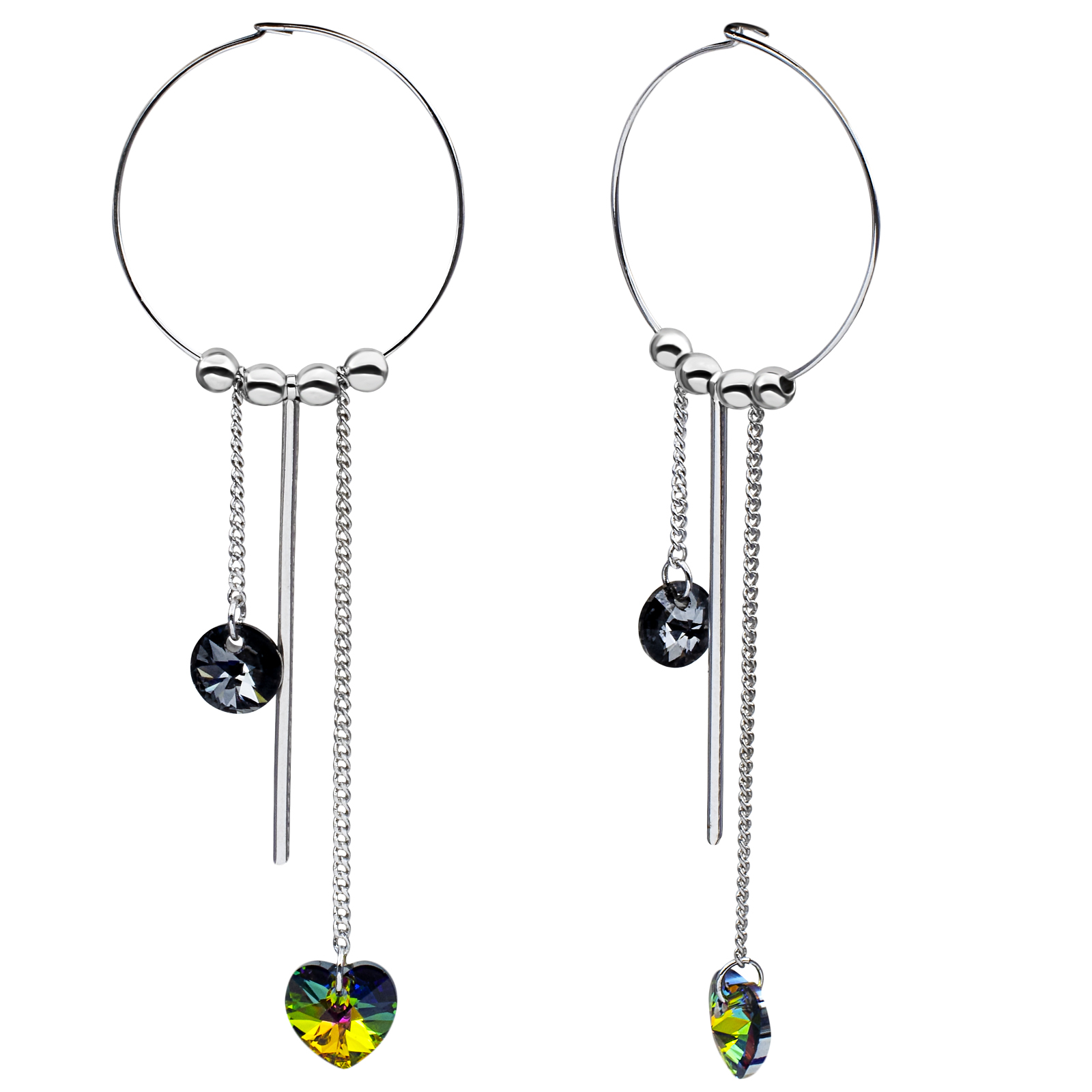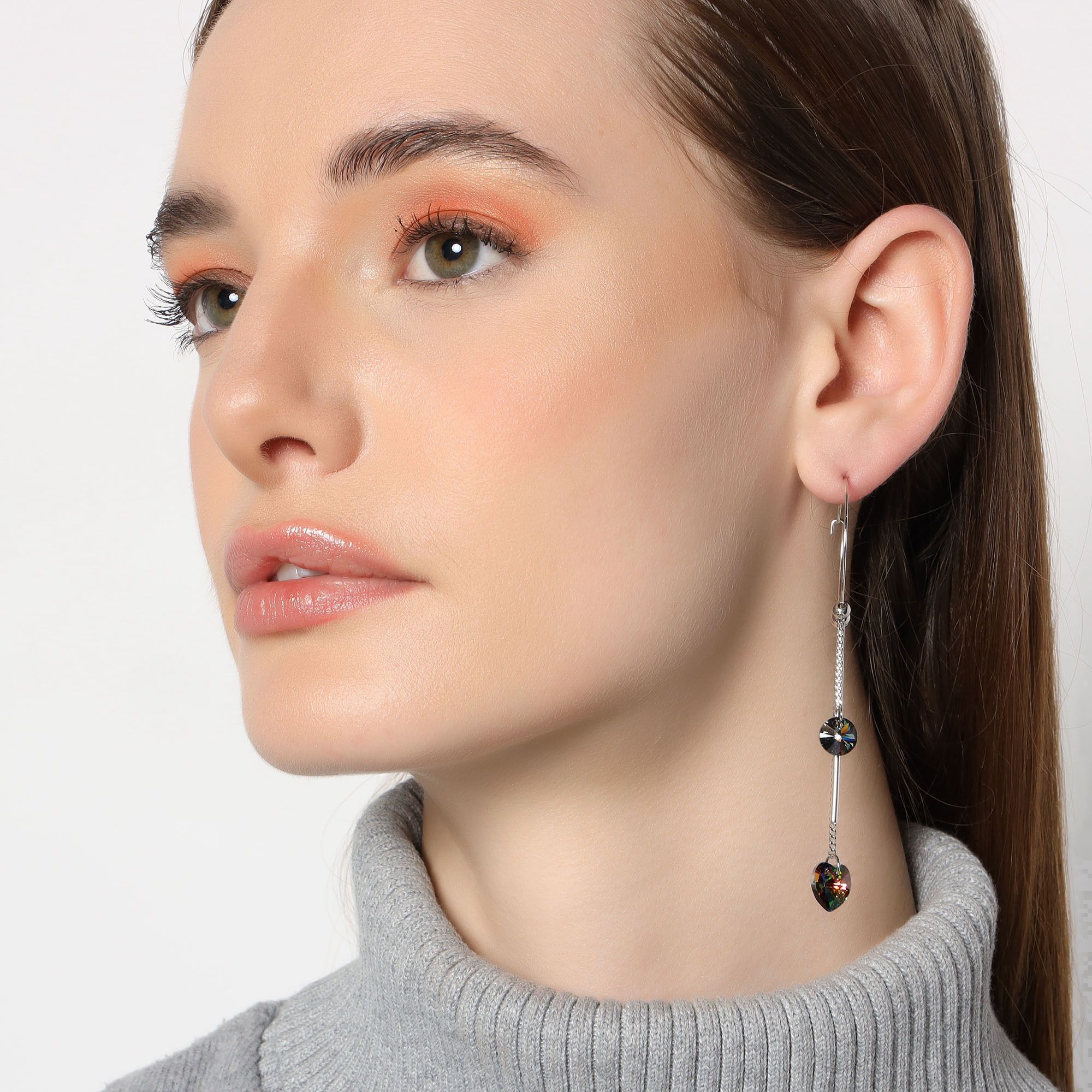 Hermosas arracadas en baño de oro blanco de 18 quilates, diseño con cristales color verde y gris oxford. Fabricado en una estructura de aleación de platino con rodio sin níquel.