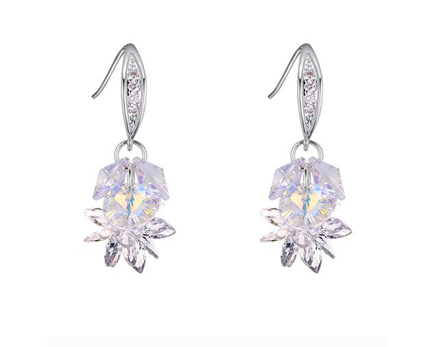 Hermosos aretes en baño de oro blanco de 18 quilates, diseño de flor con cristales en color blanco y tornasol. Fabricado en una estructura de aleación de platino con rodio sin níquel.