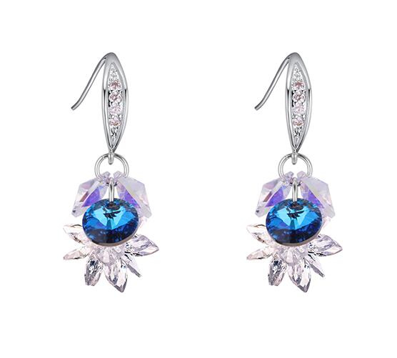 Hermosos aretes en baño de oro blanco de 18 quilates, diseño de flor con cristales color blanco y azul. Fabricado en una estructura de aleación de platino con rodio sin níquel.