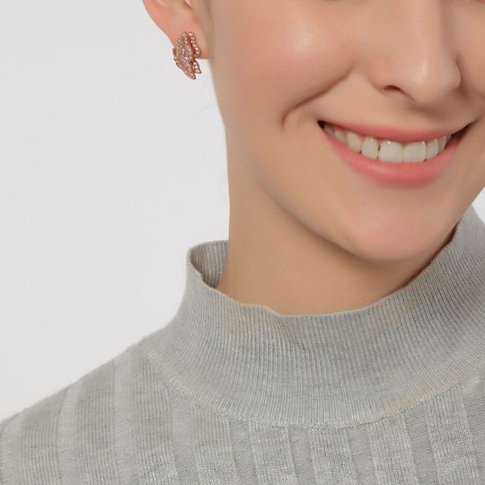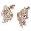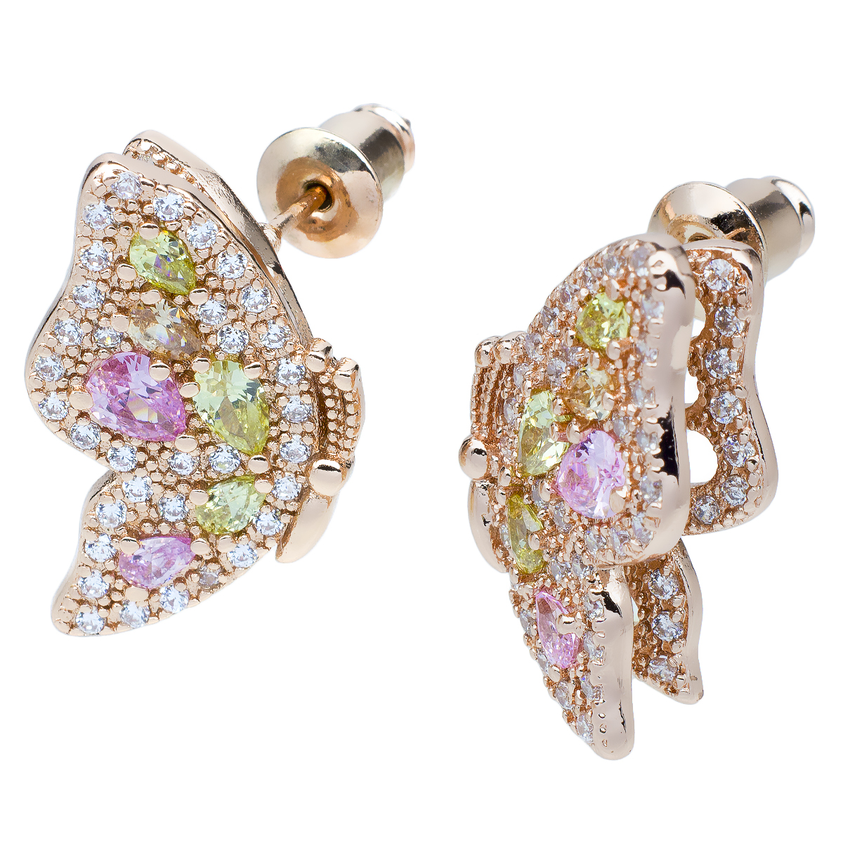 Hermosos aretes en baño de oro rosa de 18 quilates, diseño de mariposas con incrustracion de cristales en color rosa, verde y blanco. Fabricado en una estructura de aleación de platino con rodio sin níquel.