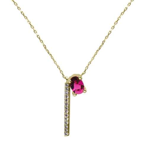Dije con cadena en baño de oro amarillo de 18 quilates, hermoso diseño con cristal rojo corte oval e incrustraciones de cristales blancos. Fabricado en una estructura de aleación de platino con rodio sin níquel.