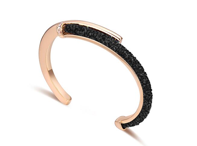 Elegante brazalete en baño de oro amarillo de 18 quilates, diseño con incrustración de cristales color blanco y negro. Fabricado en una estructura de aleación de platino con rodio sin níquel.