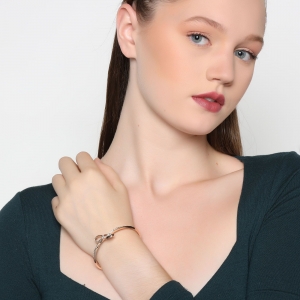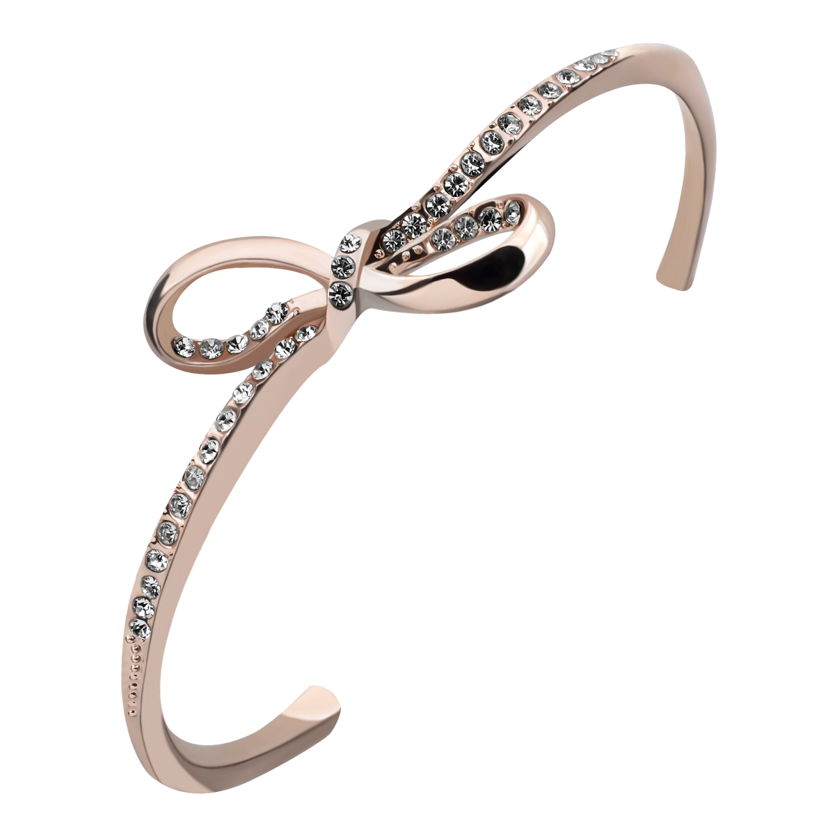 Hermoso brazalete en baño de oro rosa de 18 quilates, elegante diseño en forma de moño con incrustraciones de cristales en color blanco. Fabricado en una estructura de aleación de platino con rodio sin níquel