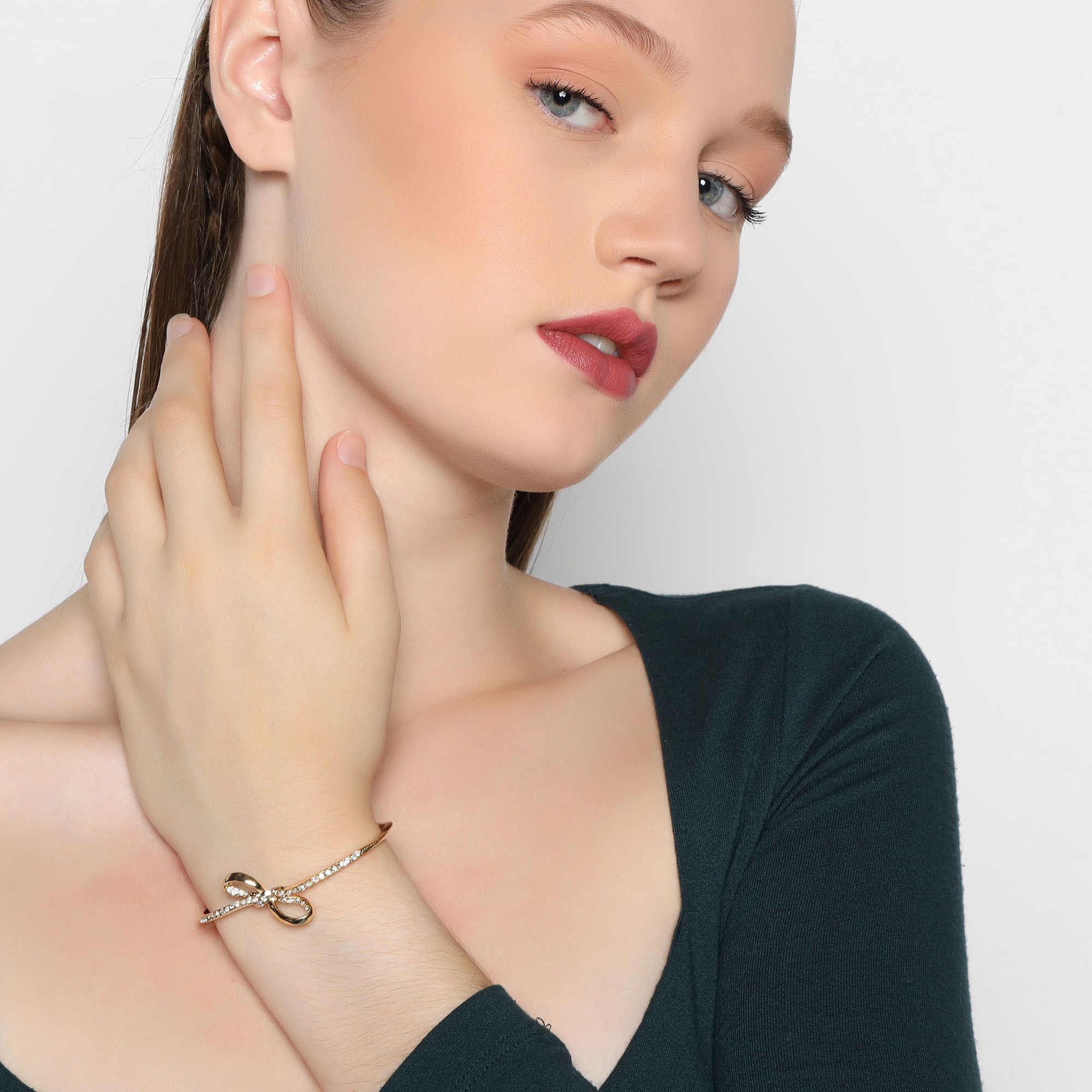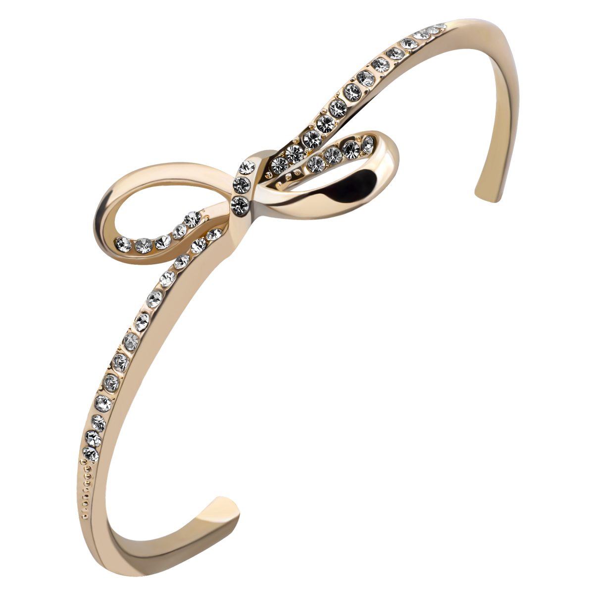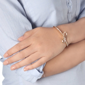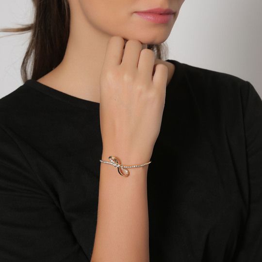 Hermoso brazalete en baño de oro amarillo de 18 quilates, elegante diseño en forma de moño con incrustraciones de cristales en color blanco. Fabricado en una estructura de aleación de platino con rodio sin níquel