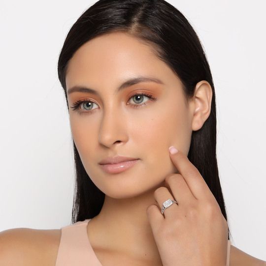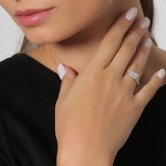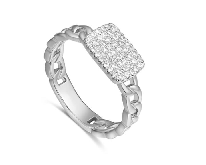 Delicado anillo, en baño de oro blanco de 18 quilates, fino diseño de cadena unido por un rectángulo, con incrustaciones de cristales en color blanco. Fabricado en una estructura de aleación de platino con rodio sin níquel.