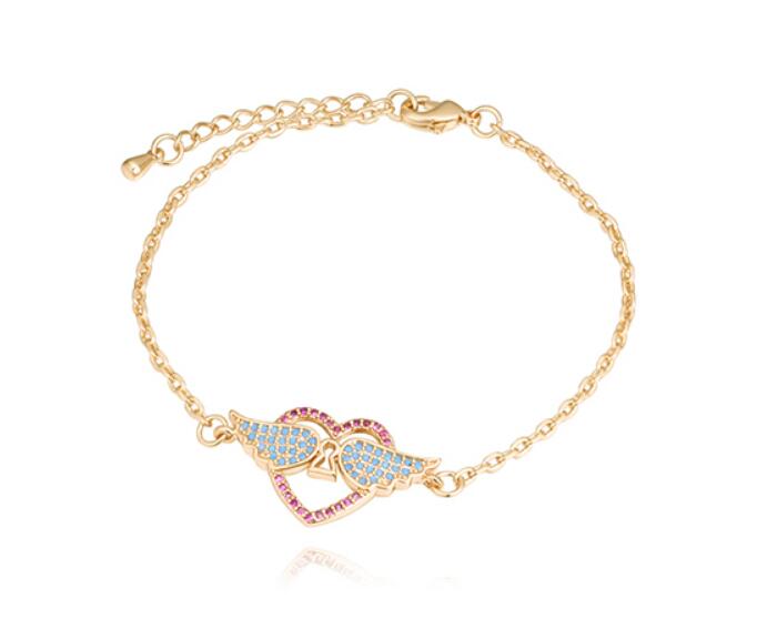Linda pulsera en baño de oro amarillo de 18 quilates, diseño con dije de corazón y pequeño cerrojo al centro e incrustración de cristales color azul y rojo. Fabricado en una estructura de aleación de platino con rodio sin níquel.