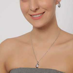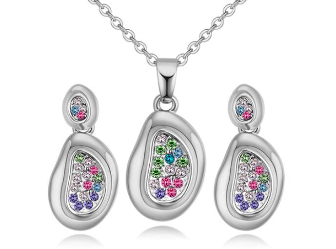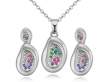 Hermoso juego de aretes y dije con cadena en baño de oro blanco de 18 quilates, original diseño ovalado, con incrustraciones de cristales en colores. Fabricado en una estructura de aleación de platino con rodio sin níquel.