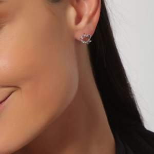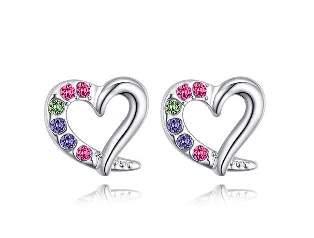 Hermosos aretes en baño de oro blanco de 18 quilates, diseño de corazón con incrustraciones de cristales en colores. Fabricado en una estructura de aleación de platino con rodio sin níquel.