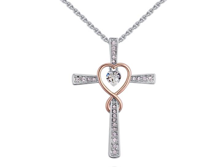 Dije con cadena en baño de oro blanco y detalle de oro rosa de 18 quilates, diseño de cruz con corazón al centro e incrustraciones de cristales en color blanco. Fabricado en una estructura de aleación de platino con rodio sin níquel.