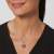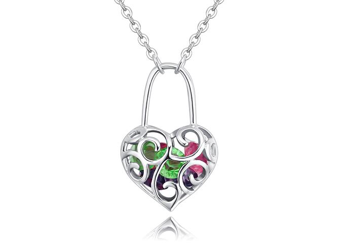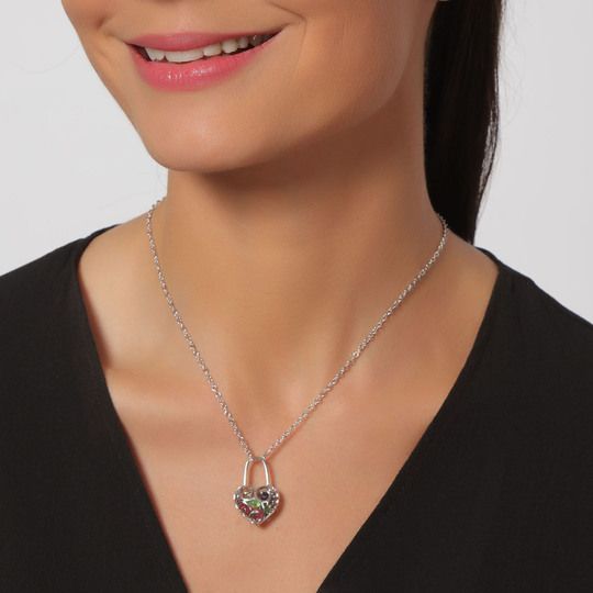 Dije con cadena en baño de oro blanco de 18 quilates, diseño de corazón calado con cristales en color verde, rosa y morado. Fabricado en una estructura de aleación de platino con rodio sin níquel.