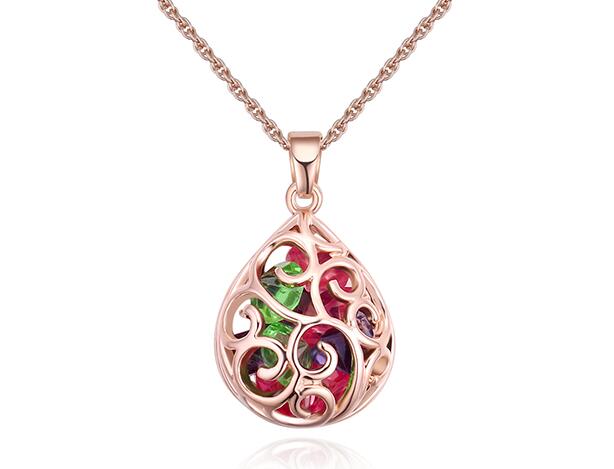 Dije con cadena en baño de oro rosa de 18 quilates, diseño forma de gota estilo calado con cristales en color rosa, verde y morado. Fabricado en una estructura de aleación de platino con rodio sin níquel.