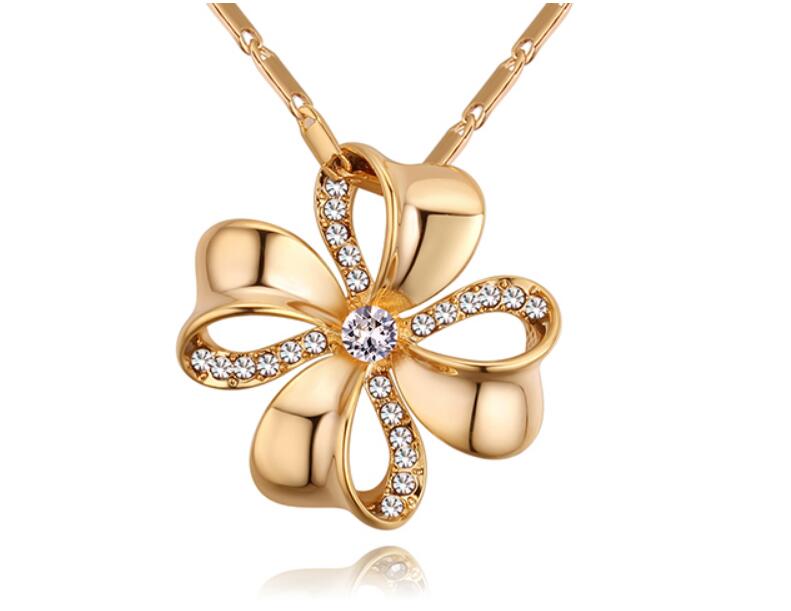 Dije con cadena en baño de oro amarillo de 18 quilates, diseño de trebol de 4 hojas con incrustraciones de cristales en color blanco. Fabricado en una estructura de aleación de platino con rodio sin níquel.