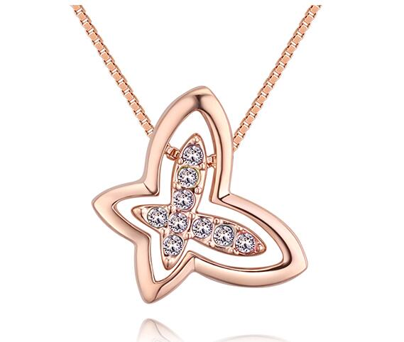 Dije con cadena en baño de oro rosa de 18 quilates, diseño de mariposa con incrustraciones de cristales en color blanco. Fabricado en una estructura de aleación de platino con rodio sin níquel.