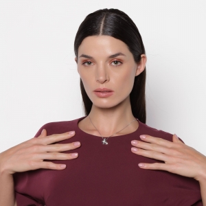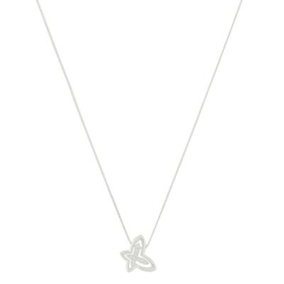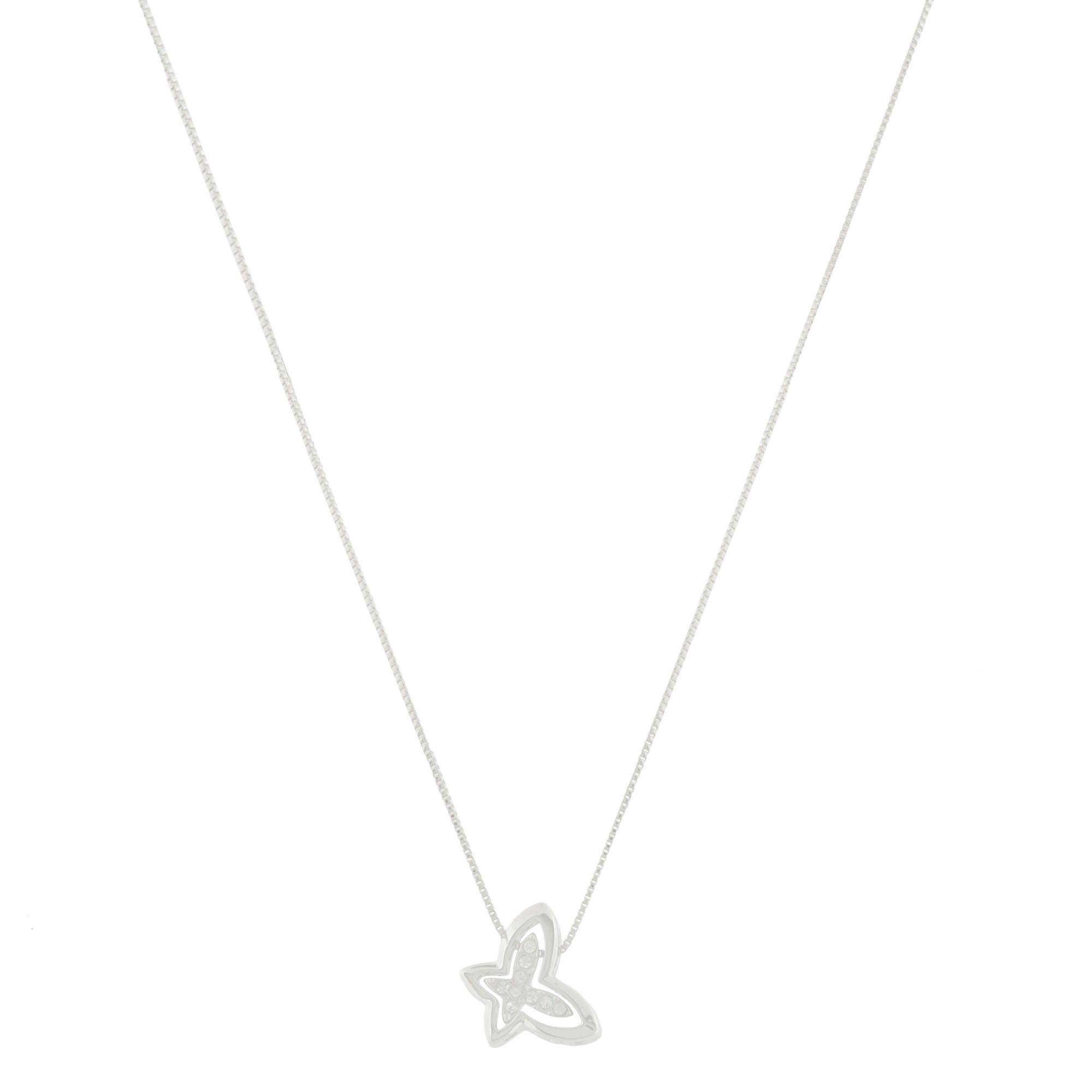 Dije con cadena en baño de oro blanco de 18 quilates, diseño de mariposa con incrustraciones de cristales en color blanco. Fabricado en una estructura de aleación de platino con rodio sin níquel.