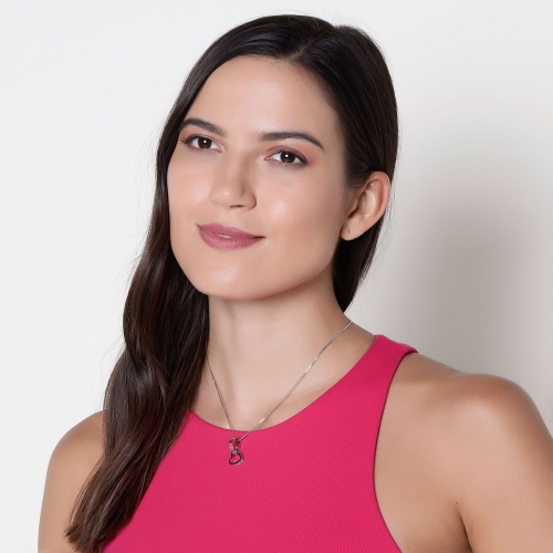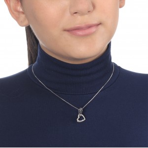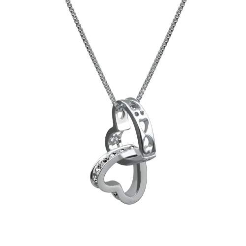 Hermoso dije con cadena en baño de oro blanco de 18 quilates, diseño dos corazones entrelazados con incrustraciones de cristales en color blanco. Fabricado en una estructura de aleación de platino con rodio sin níquel.