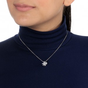 Hermoso dije con cadena en baño de oro blanco de 18 quilates, diseño con cristales blancos formando una flor. Fabricado en una estructura de aleación de platino con rodio sin níquel.