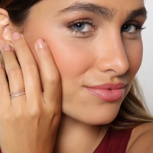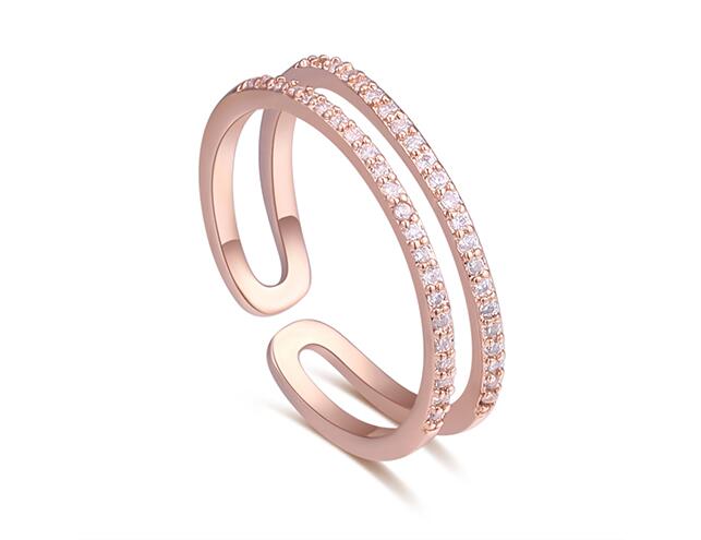 Lindo anillo, en baño de oro rosa de 18 quilates, bello diseño, con doble hilera de cristales en color blanco. Fabricado en una estructura de aleación de platino con rodio sin níquel.