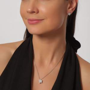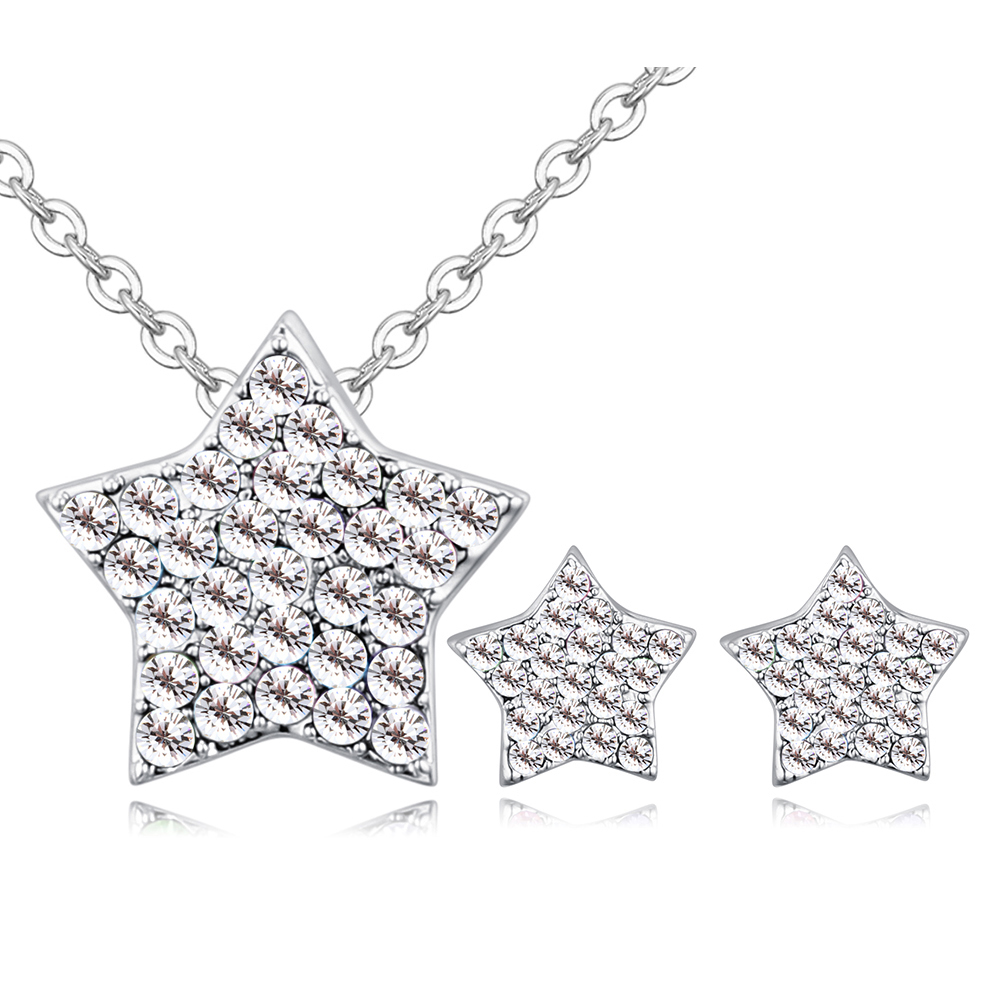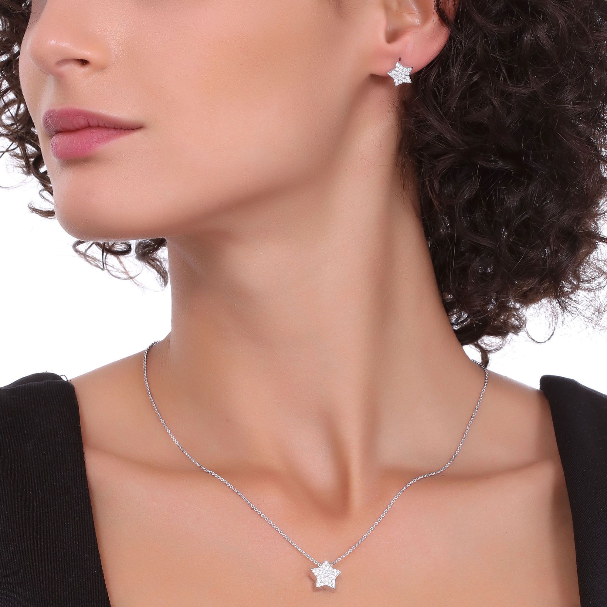 Hermoso juego de aretes y dije en baño de oro blanco de 18 quilates, diseño de estrellas con incrustaciones de cristales en color blanco. Fabricado en una estructura de aleación de platino con rodio sin níquel.