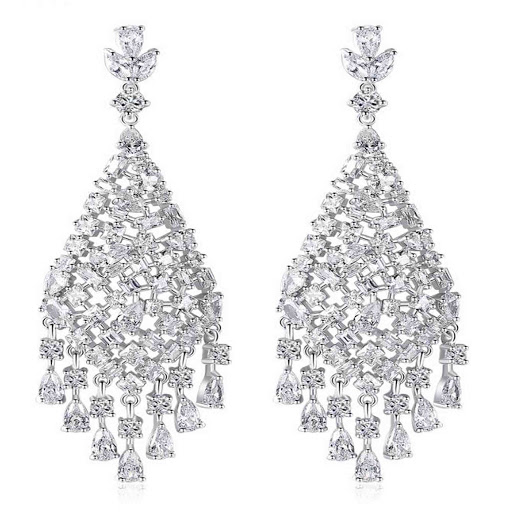 Aretes en baño de oro blanco de 18 quilates, elegante diseño de gota con cascada e incrustaciones de cristales color blanco. Fabricado en una estructura de aleación de platino con rodio sin níquel.