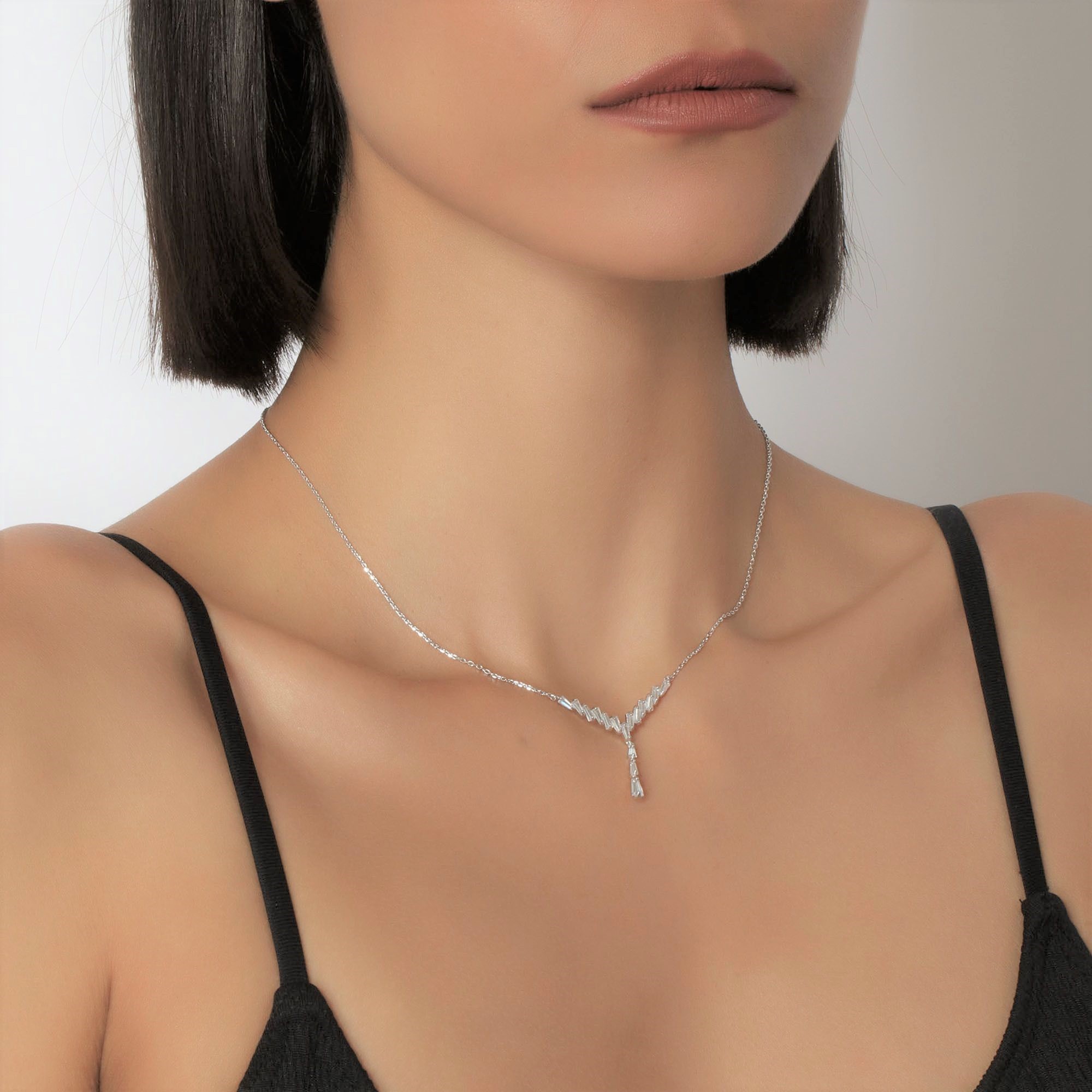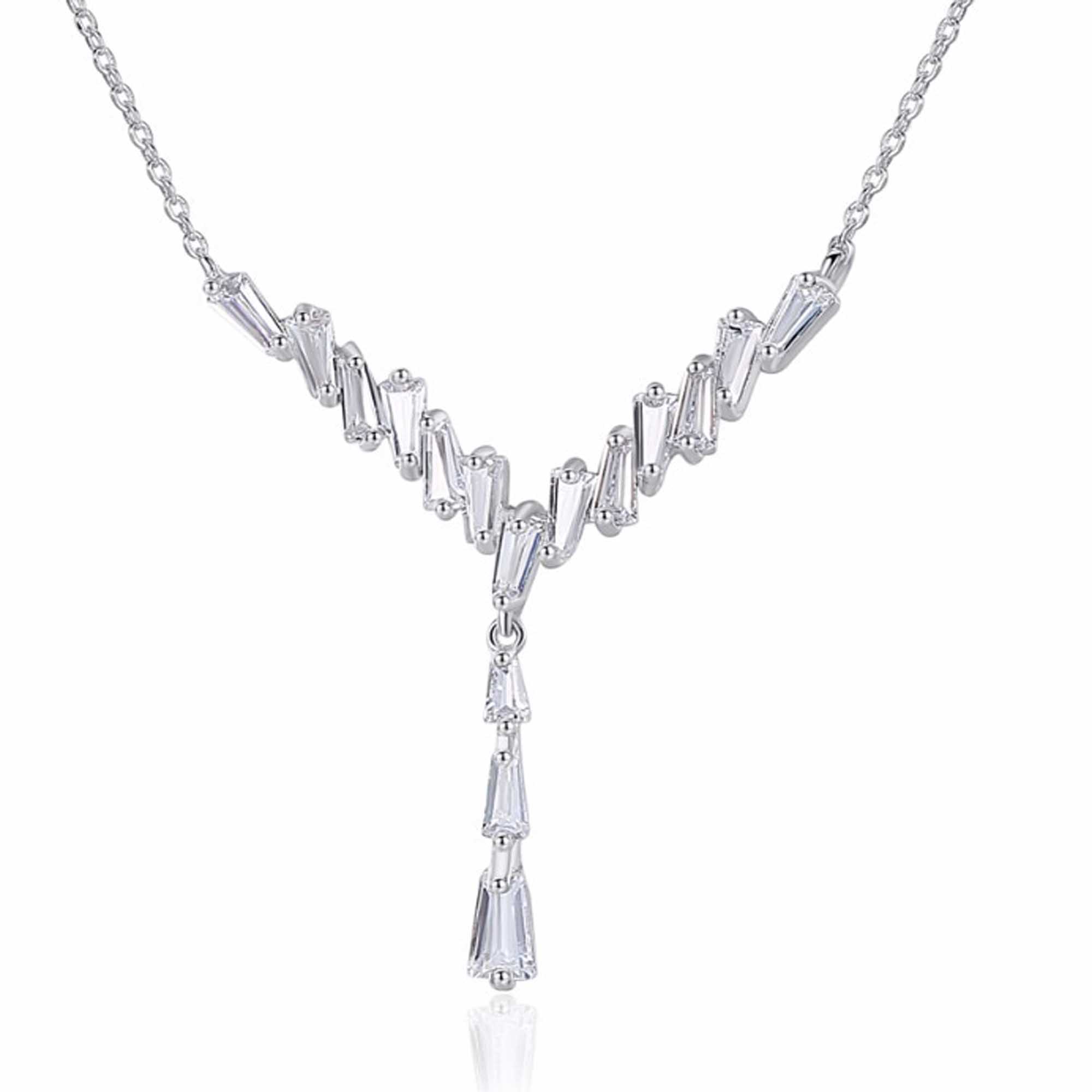 Elegante collar en baño de oro blanco de 18 quilates, elegante diseño con cristales blancos corte baguette cónico. Fabricado en una estructura de aleación de platino con rodio sin níquel.