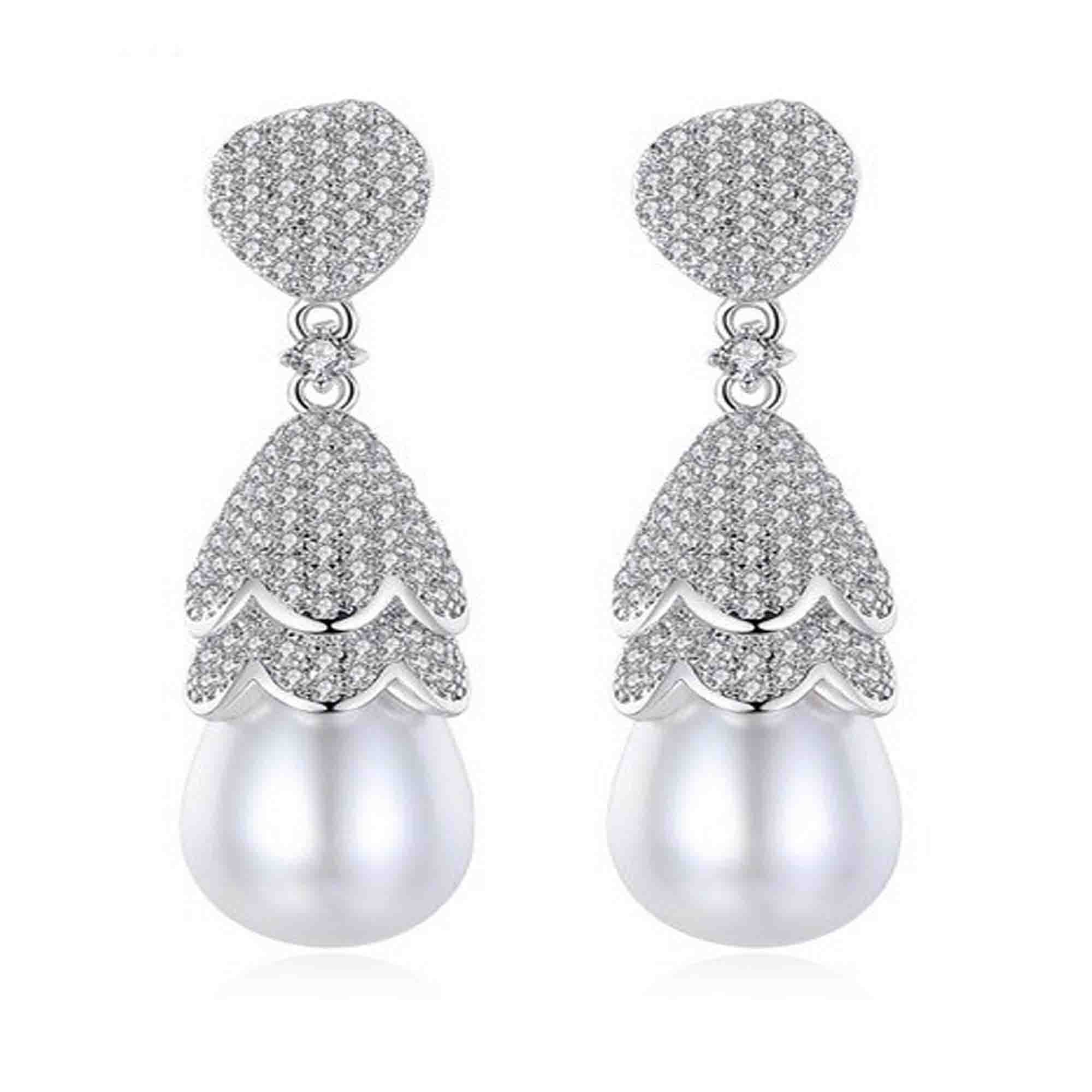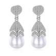 Aretes en baño de oro blanco de 18 quilates, diseño de gota con cristales en color blanco y detalle de perla. Fabricado en una estructura de aleación de platino con rodio sin níquel.