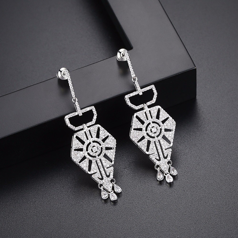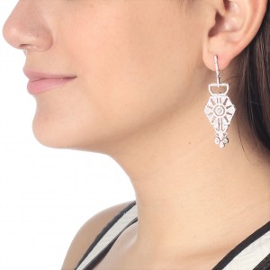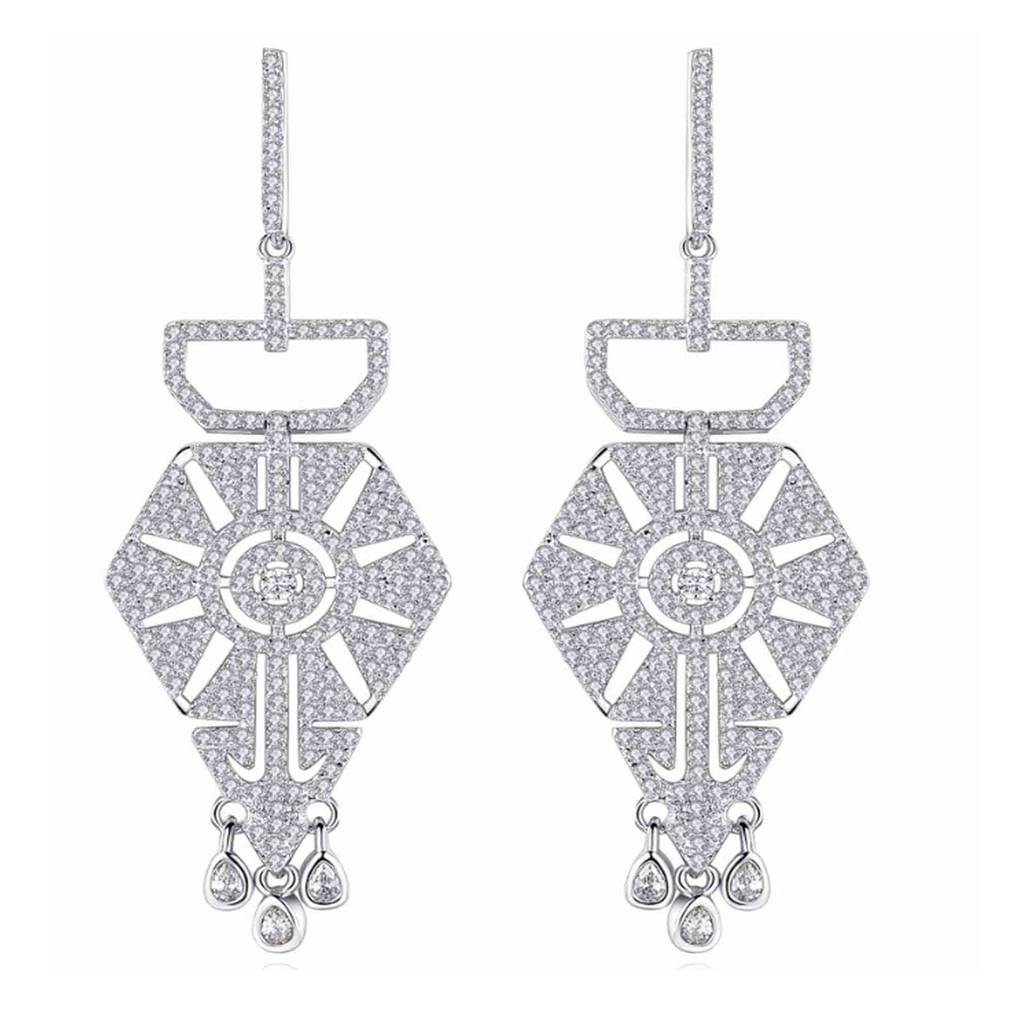 Sofisticados pendientes en baño de oro blanco de 18 quilates, fino diseño de pentágono calado con cristales en color blanco. Fabricado en una estructura de aleación de platino con rodio sin níquel.