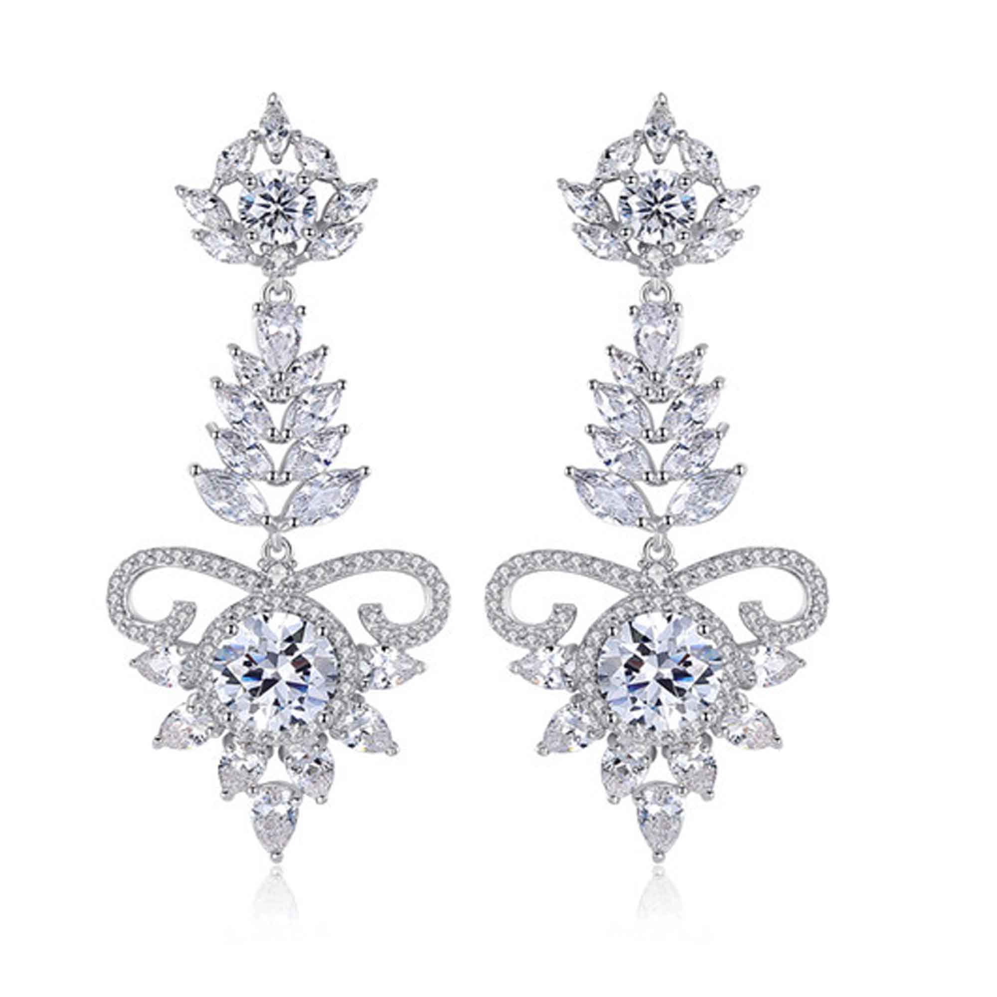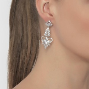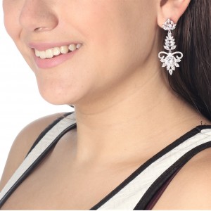 Refinados aretes en baño de oro blanco de 18 quilates, diseño de grecas y hojas con exquisitos cristales en color blanco. Fabricado en una estructura de aleación de platino con rodio sin níquel.