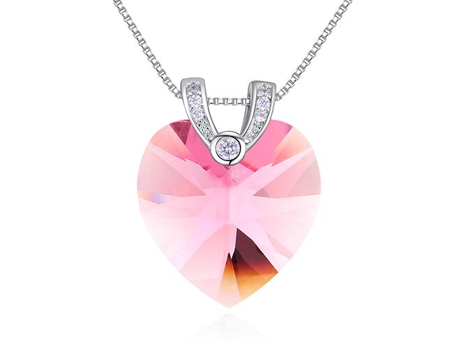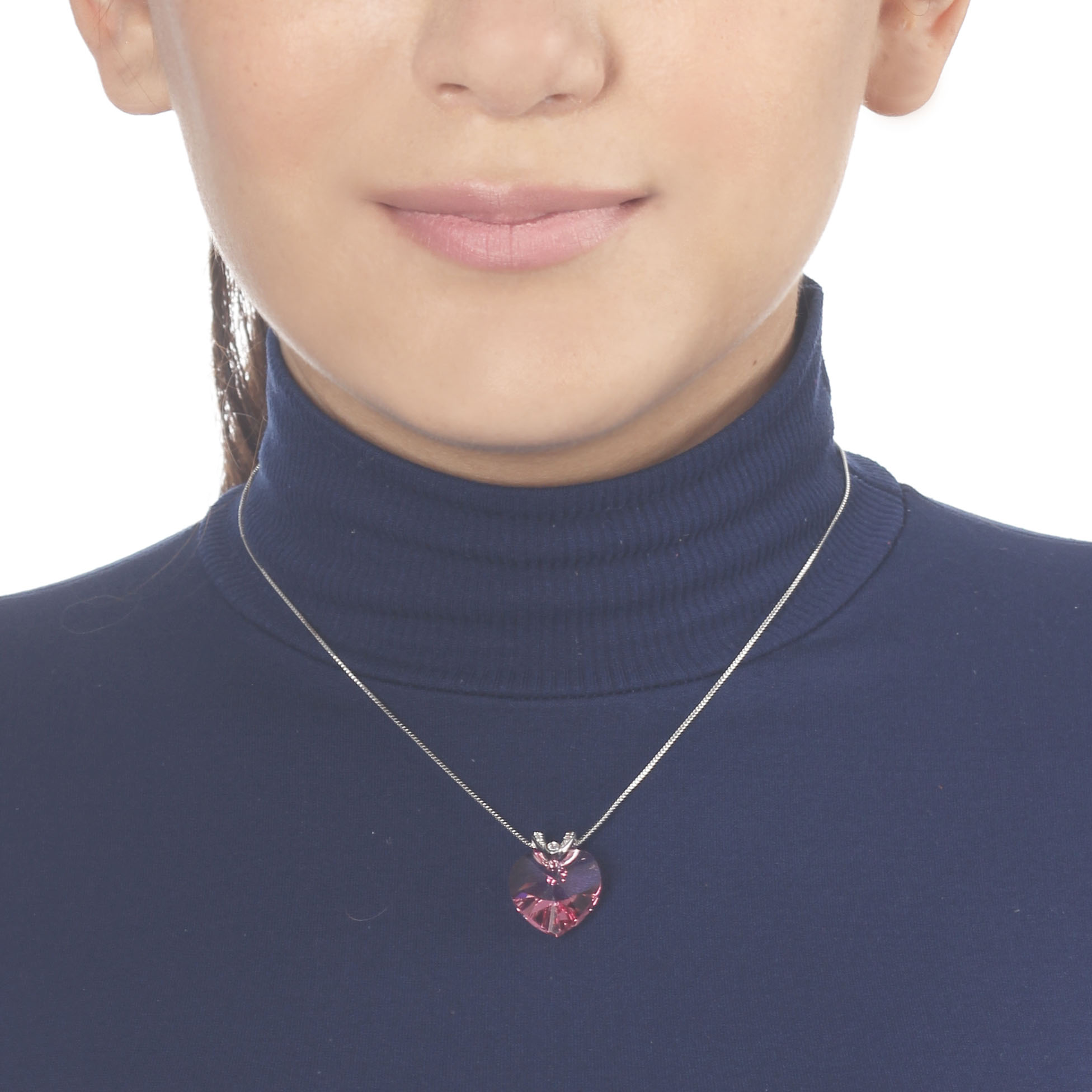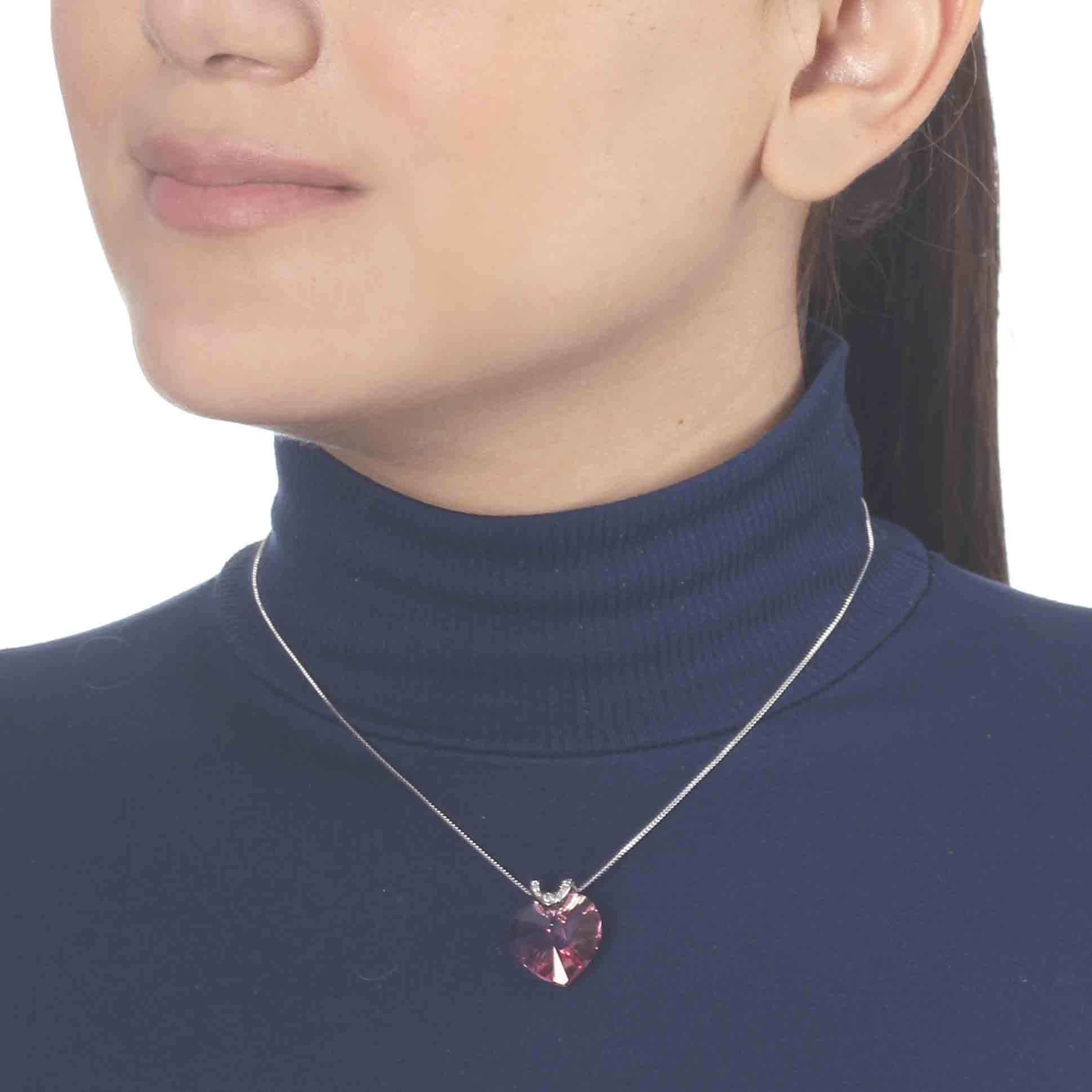 Lindo dije con cadena en baño de oro blanco de 18 quilates, diseño con corazón de cristal rosa e incrustaciones de cristales blancos. Fabricado en una estructura de aleación de platino con rodio sin níquel.