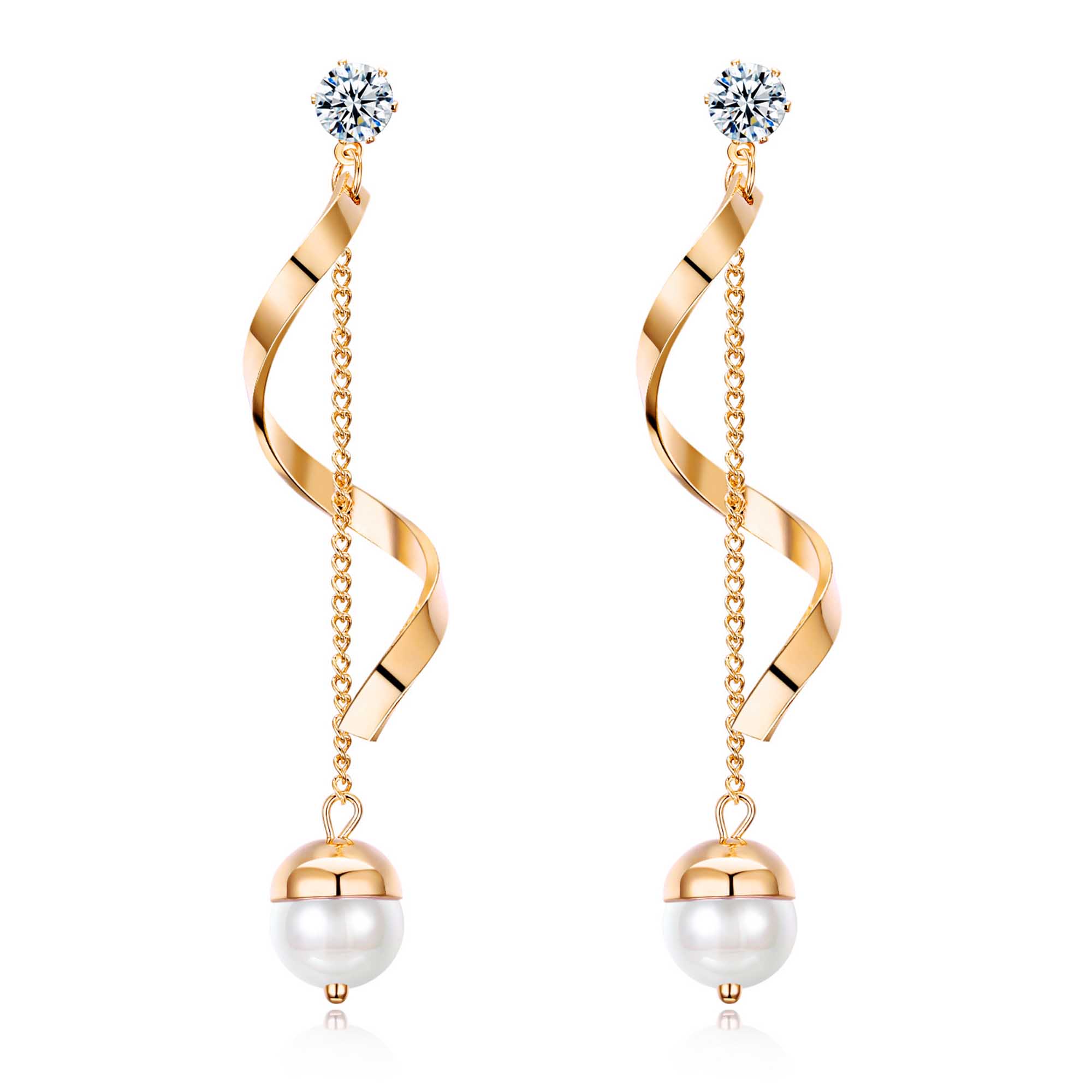 Lindos pendientes en baño de oro amarillo de 18 quilates, diseño de espiral con cristales en color blanco y detalle de perla blanca. Fabricado en una estructura de aleación de platino con rodio sin níquel.