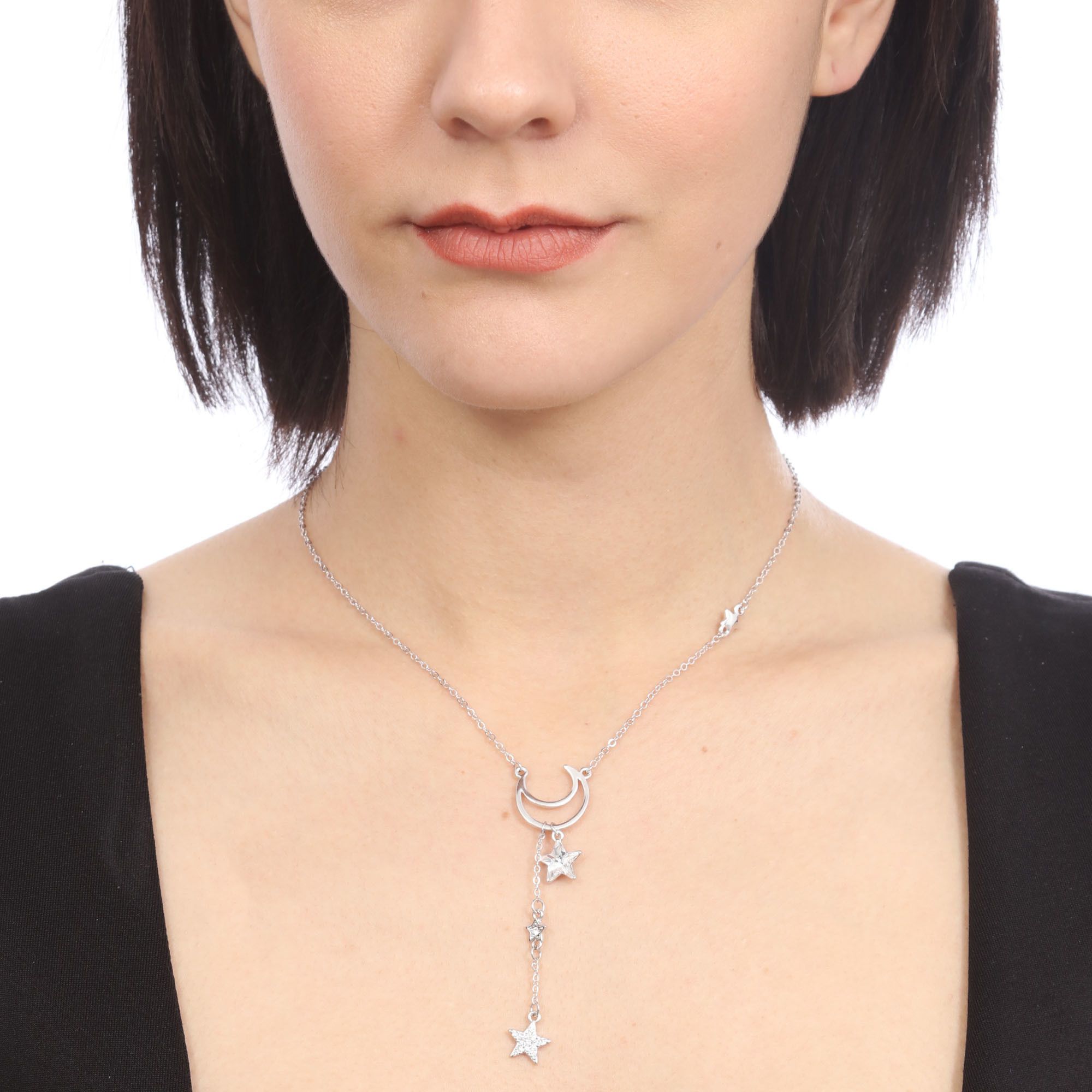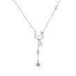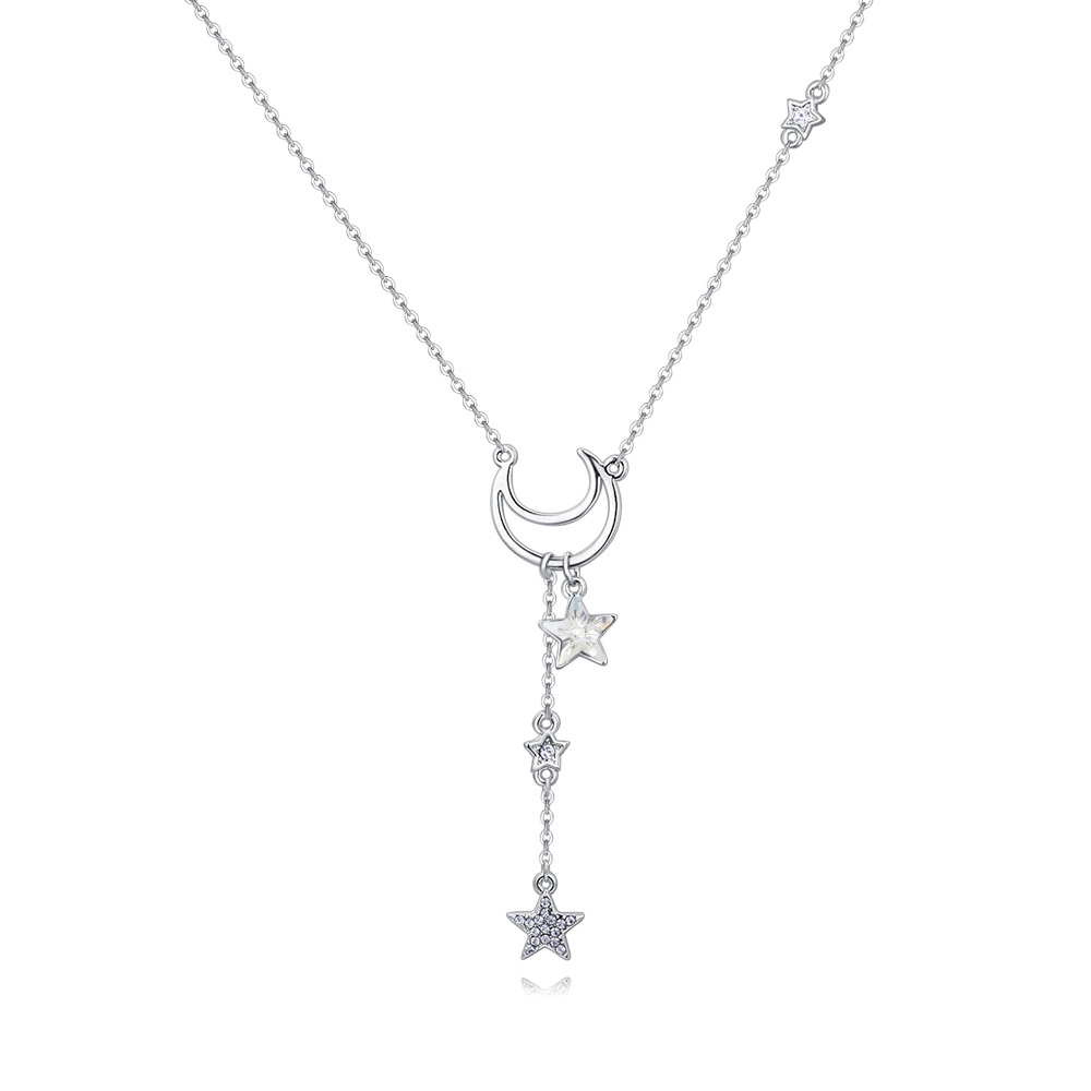 Collar en baño de oro blanco de 18 quilates, original diseño con pequeña media luna, dijes en forma de estrellas, con incrustraciones de cristales en color blanco y estrella de cristal blanco. Fabricado en una estructura de aleación de platino con rodio sin níquel.