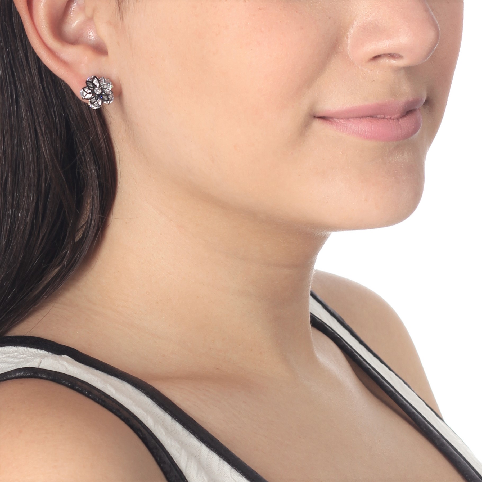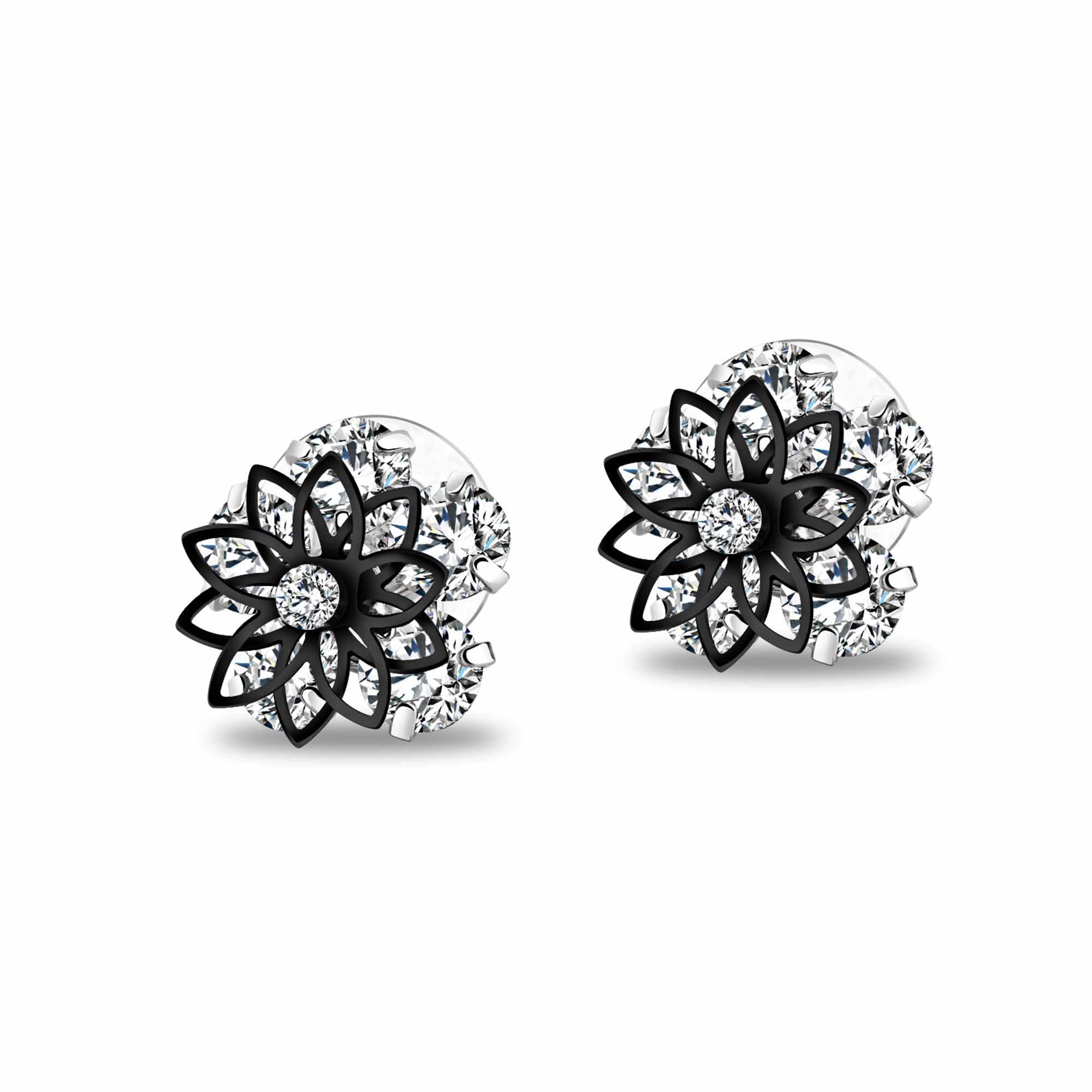 Aretes con detalles de baño de oro blanco de 18 quilates, hermoso diseño de flor con contorno color negro y cristales blancos. Fabricado en una estructura de aleación de platino con rodio sin níquel.