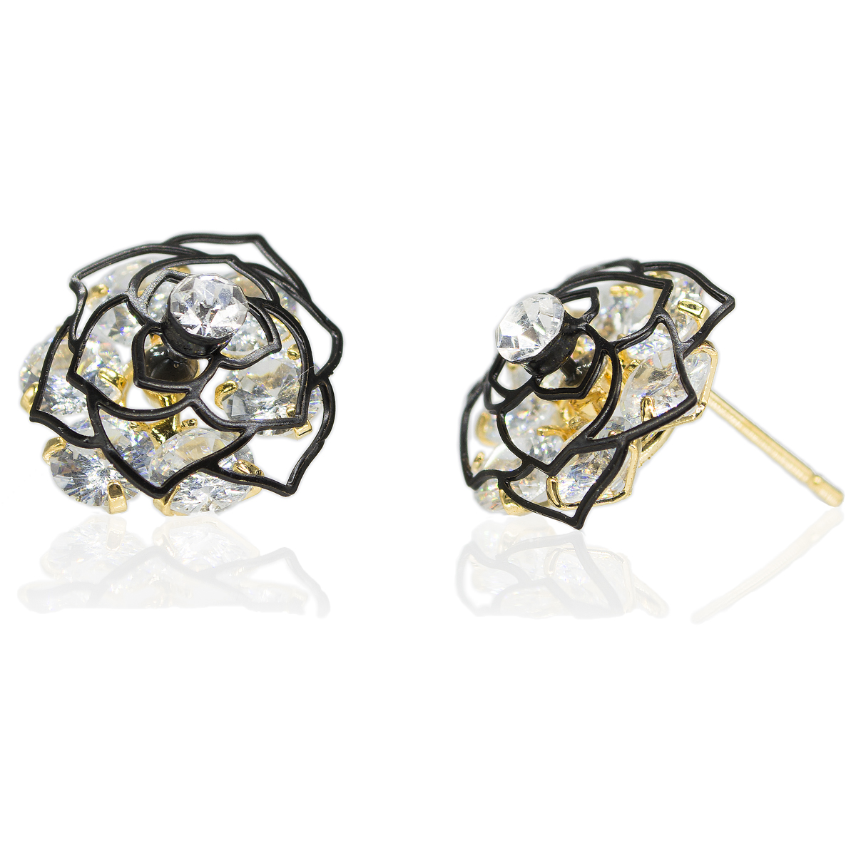 Aretes con detalles de baño de oro amarillo de 18 quilates, hermoso diseño de flor con contorno color negro y cristales blancos. Fabricado en una estructura de aleación de platino con rodio sin níquel.