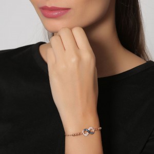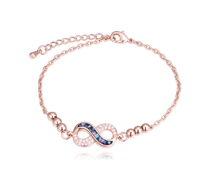 Linda pulsera en baño de oro rosa de 18 quilates, diseño con dije de infinito con incrustraciones de cristales en color blanco y con detalles de concha nácar. Fabricado en una estructura de aleación de platino con rodio sin níquel.