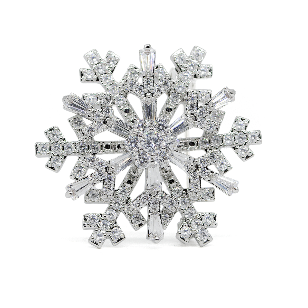 Lindo prendedor en baño de oro blanco de 18 quilates, diseño de copo de nieve con incrustraciones de cristales color blanco. Fabricado en una estructura de aleación de platino con rodio sin níquel.